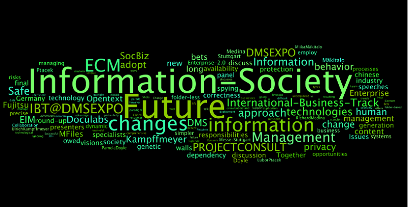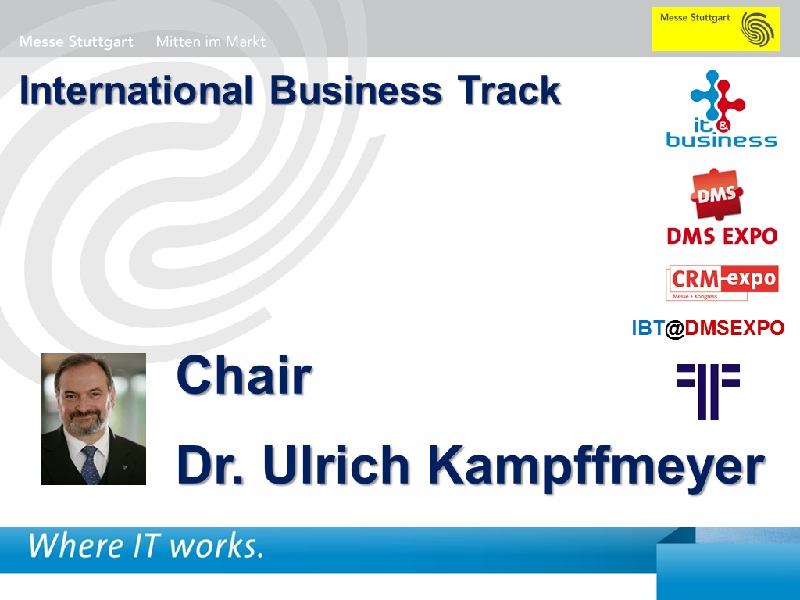 The International Business Track IBT@DMSEXPO provides an insight into the international trends of Enterprise Information Management. Well known analysts, industry evangelists and trend leaders show their view on the future of information management. The half-day session is chaired for the second time by Dr. Ulrich Kampffmeyer (http://bit.ly/PCHH-Kff), president of PROJECT CONSULT in Hamburg . The three major topics circle around “The Future of …”