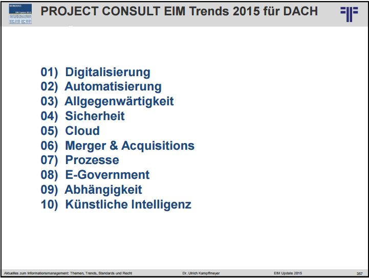 Die zehn angesprochenen Hauptthemen, nicht alles unbedingt Trends im klassischen Sinn, seitens PROJECT CONSULT waren: