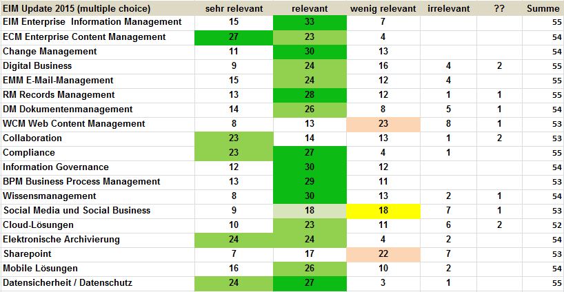 Begrifflich führt ECM Enterprise Content Management weiterhin vor EIM Enterprise Information Management. Die häufigen Nennungen von EIM sind sicher der Tatsache geschuldet, dass die Veranstaltung EIM Update hieß. Das Akronym ist noch lange nicht so prominent im Markt platziert. Records Management gewinnt an Bedeutung und liegt inzwischen für sehr relevant und relevant bei 75%, Social Media/Business verliert. Mit dem "Nachfolger" von Social Business – Digital Business – können einige (rund 40%) offenbar auch noch wenig anfangen. Allerdings dürfte sich Vieles aus dem Collaboration-Umfeld auch dem Thema Social zuordnen lassen. Natürlich sind die Information-Governance-, Compliance- und Datenschutz-Themen immer wichtig. Business Process Management ist weiterhin eines der herausragenden Themen, zu dem auch vermehrt Projekte gestartet werden. Zu erwarten war, dass im Teilnehmerkreis WCM Web Content Management kaum eine Rolle spielt. Erstaunlich dagegen, dass Sharepoint mehrheitlich als wenig oder gar irrelevant (55%) klassifiziert wurde. Mobile Lösungen gewinnen ebenso wie Cloud. Bei beiden steigt das Interesse im Verglkeich zu den Vorjahren. Change Management als wichtige Komponente aller Vorhaben wird von der Mehrheit als relevant eingeschätzt – eine erfreuliche Entwicklung.