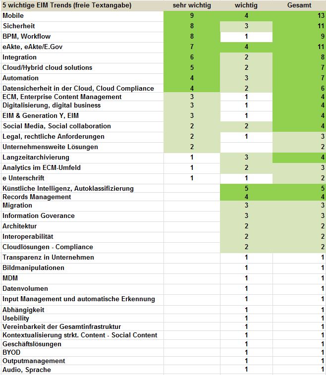 Zunächst tut sich eine andere Begriffswelt auf. Zu den in der ersten Tabelle benutzen Themen kommen prominent die elektronische Akte und die Integration von Lösungen in die bestehende Softwarelandschaft. Automatisierung spielt mit mehreren Aspekten eine wichtige Rolle – vom Inputmanagement über die automatische Klassifikation bis zur Automatisierung von Prozessen. Das Thema Cloud findet sich besonders unter Sicherheitsaspekten wieder. Und Bigdata wird auch zukünftig eine Rolle bei Auswertung und Automatisierung im ECM-Umfeld spielen.