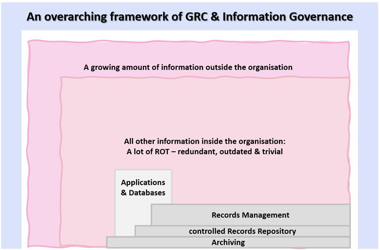 Generell ist Information Governance eine übergreifende Disziplin, die Methoden wie Enterprise Content Management, Records Management, Information Lifecycle Management, Archiving etc. einschließt. Sie spannt den Bogen über alle Informationen einer Organisation (http://bit.ly/3x1MLFb). Records Management verwaltet und kontrolliert nur einen kleinen Teil aller Information im Unternehmen. Datenbanken und Anwendungen kontrollieren weitere Daten und Dokumente. Was vielfach fehlt, ist die übergeordnete Strategie, wie im Unternehmen mit generell Information umzugehen ist. Information Governance ist wesentlicher Bestandteil dieser übergeordneten Strategie.