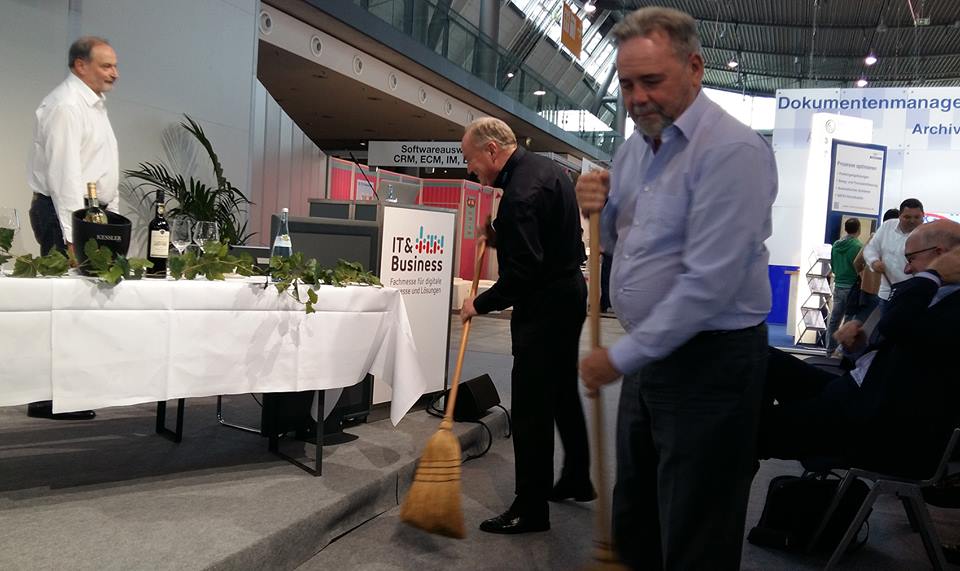Man kann es nicht leugnen – noch immer weht eine Hauch aus alten DMS, ECM und ähnlichen Tagen durch die Halle, wenn man sich die Aussteller ansieht. Seitens PROJECT CONSULT waren wir eigentlich bewährtem Konzept unterweg: eine Keynote, eine Spezialpräsentation, ein paar Panels. Der Titel und das Format "Besen" für das Abschluss-Panel konnten sich noch nicht vom "Stammtisch" der Vorjahre befreien. Angesichts der Trübsal in der Halle am ersten Tag wählten wir als Motto für alle unsere Vorträge und Panels "Always look on the bright Side of Life" (inkl. Text zum Mitsingen) von Monthy Python. Ob es geholfen hat? Auf jeden Fall hielt sich der Andrang der Zuhörer in Grenzen. Vor der Bühne standen weniger Stühle (zumindest vor unserer Bühne). Auch der Kranz der Umstehenden war deutlich lichter. Es machte sich bemerkbar, dass weniger Besucher auf der Veranstaltung waren. So blieb uns ein wenig mehr Zeit in der "Consulter Lounge" und bei unserem Gastgeber, dem Dok.Magazin/Digitus (Danke an Birgit). Auf jeden Fall versuchten Reinhard Karger und ich in unseren Sessions etwas zu bewegen und das Abschluss-Panel, der Besen, wurde ein wenig auch zur Show – mit ausfegenden Ausstellern, Wein für alle und einer gelösten, lockeren Diskussionsatmosphäre. Vielleicht ist es auch mehr Show, was die Veranstaltung braucht.