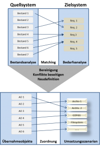 In vielen komplexen Migrationsprojekten hat sich in der Praxis gezeigt, dass der zunächst evaluierte Übernahmebestand nicht mit den tatsächlichen Anforderungen übereinstimmt. Der Grund liegt darin, dass die Bestandsanalyse meist technisch getrieben ist. Es werden IT-Systeme, Archivsysteme und gespeicherte Daten- und Dokumentenbestände analysiert. Die Bedarfsanalyse dagegen evaluiert die rechtlichen, fachlichen Anforderungen. Deshalb lassen sich häufig nicht alle gefundenen Bestände einer tatsächlichen Anforderung zuweisen und umgekehrt fehlen Dokumentenbestände, die die Fachseite eigentlich erwarten würde.