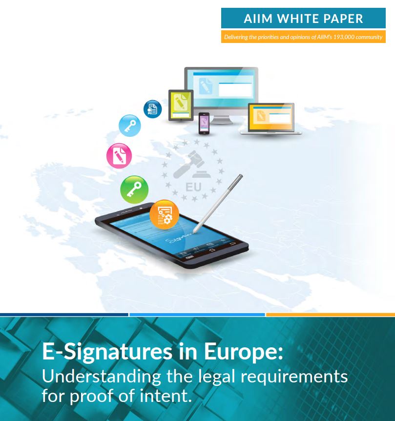 Unter Mitwirkung von KOFAX entstand das AIIM White Paper zu elektronischen Signaturen in Europa, dass sich insbesondere mit den Auswirkungen der europäischen Richtlinie eIDAS beschäftigt, die am 1.7.2016 europaweit in Kraft tritt. AIIM macht mit dem Whitepaper und einem dazugehörigen Webinar deutlich, dass auch der europäische Markt im Fokus des internationalen Verbandes steht. Um in den verschiedenen Nationen ins Details zu gehen, ist die Übersichtsstudie allerdings zu dürftig. Das 12seitige Whitepaper kann auf der AIIM-Webseite kostenfrei heruntergeldaden werden. Auf Slideshare gibt es die Folien des zugehörigen Webinars.