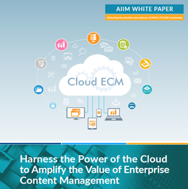Dieses AIIM White Paper beschäftigt sich mit den Implikationen des Einatzes von ECM Enterprise Content Management in der Cloud. In dem 9seitigen Strategiepapier geht es im Wesentlichen um die Akzeptanz und die strategische Ausrichtung des Einsatzes von ECM als SaaS aber auch als Private-Cloud-Lösung, Das Whitepaper kann kostenfrei heruntergeladen werden (Download bei AIIM).