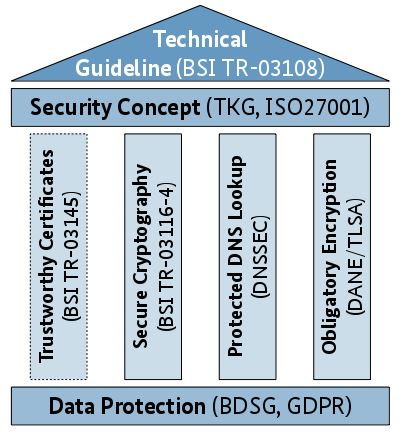 Das Sichertheitskonzept setzt auf bestehenden nationalen wie auch internationalen Vorgaben und Standards auf. Grundlage sind das aktuelle BDSG Bundesdatenschutzgesetz und die ab Sommer geltende GDPR (DS-GVo Datenschutz-Grundverordnung der EU). Zwei andere BSI Technische Richtlinie decken die "vertrauenswürdige Zertifizierung" (BSI TR-03146 Trustworthy Certification) und die krypografische Verschlüsselung (BSI TR-03116-4 Secure Cryptography) ab. Bei den DNS-Aufrufen wird der "Protected DNS Lookup" nach DNSSEC (Domain Name System Security Extensions) verlangt. Bei der verbindlichen Verschlüsselung wird auf die "Obligatory Encryption nach DANE (DNS-based Authentication of Named Entities) und TLSA (RFC 6698) gesetzt. Letztere Vorgaben sind anderen Ortes längst Standard. Diese vier technsichen Vorgaben werden nach TKG Telekommunikationsgesetz und dem Sicherheitstandard ISO 27001 zusammen mit den Datenschutzanforderungen als durchgängiges Konzept betrachtet.