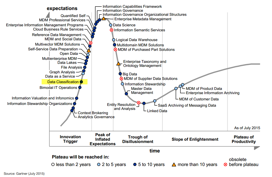 Von Gartner gibt es auch einen Hype Cycle für EIM Enterprise Information Management (wann werden denn endlich ECM und EIM zusammengeführt?) – die 59 Seiten kosten allerdings fast 2000 $US (deshalb gibt es hier nur die Grafik des EIM Hype Cycle von 2015).