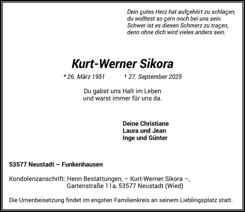 Am 27.09.2025 ist mein Geschäftsfreund und langjähriger Wegbegleiter Kurt-Werner Sikora verstorben (Traueranzeigen von Kurt-Werner Sikora | ga.trauer.de). Mein herzliches Beileid an alle Angehörigen und Freund:innen von Kurt-Werner.