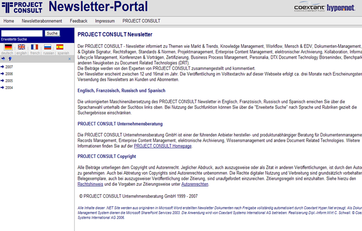 Unser ursprüngliches Newsletter-Archiv bei Coextant auf Basis eines Sharepoint 2003 mussten wir abschalten, denn ein Update wäre zu aufwändig gewesen. Das Archiv beinhaltete alle Newsletter von 1999 bis 2010, zum Teil in mehrsprachiger Übersetzung (Maschinenübersetzung in Englisch, Französisch, Russisch und Spanisch).
